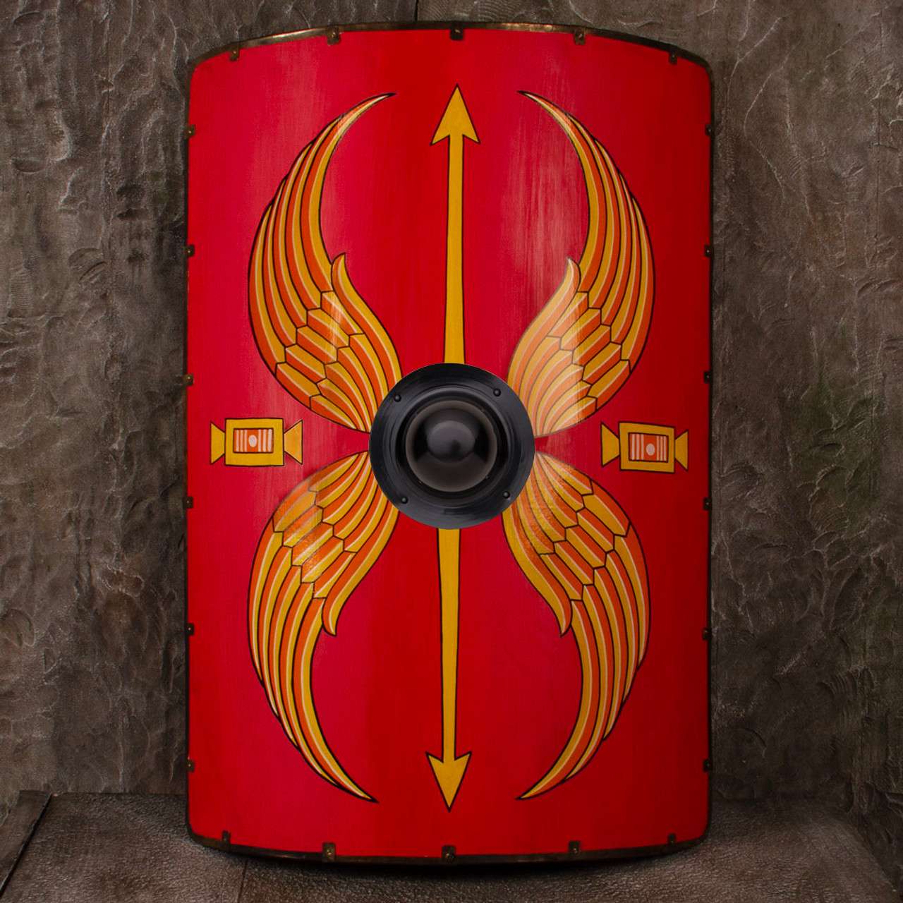 Crafted for display, reenactment, or cosplay, it features bold Roman colors and the distinctive thunderbolt and wings—symbols of strength and protection. The large curved design offered real warriors full-body defense while marching into battle.